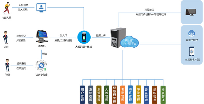 采用了B/S云架構,部署在云服務器上,是整個系統的功能實現的核心支撐,用于設備的連接,數據的采集和存儲分析,以及操作流程的管理。系統集成了常駐人員核驗及通行管理、外來訪客人員登記、訪客審核、訪客進出管理、門禁聯動、權限管理、設備管理、用戶管理、賬戶管理、組織架構等多個功能。同時集合了人工智能、人臉識別、物聯網、移動互聯網和云服務等多重先進技術,軟硬件深度融合,提供無感通行和快速出入的使用體驗,操作簡便高效,有效提高人員進出管理的安全性和通行效率。